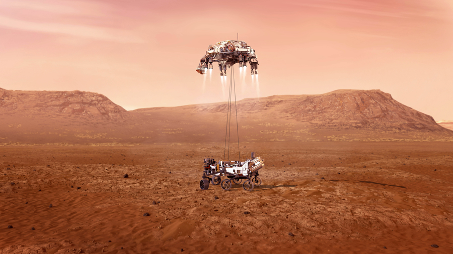 2021年2月18日,“毅力”号火星车在火星成功着陆,寻找火星上可能存在过的生命迹象。 新华社发(美国航天局供图)